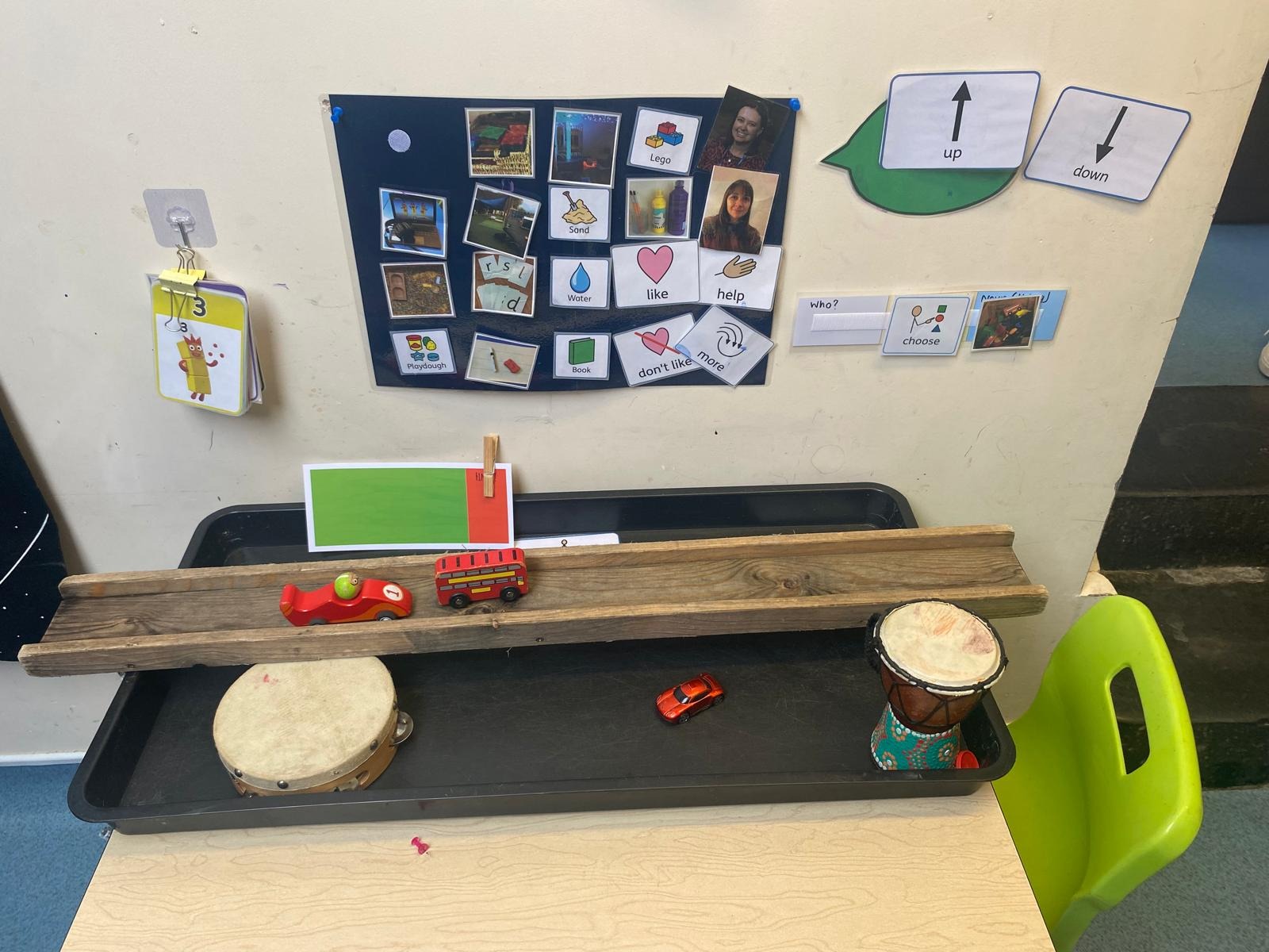 We use a number of strategies to fully engage with SEN-D children, we use the child’s interests, likes and passions to make them feel happy in their learning environment, this is a example of a child’s personalised workstation.